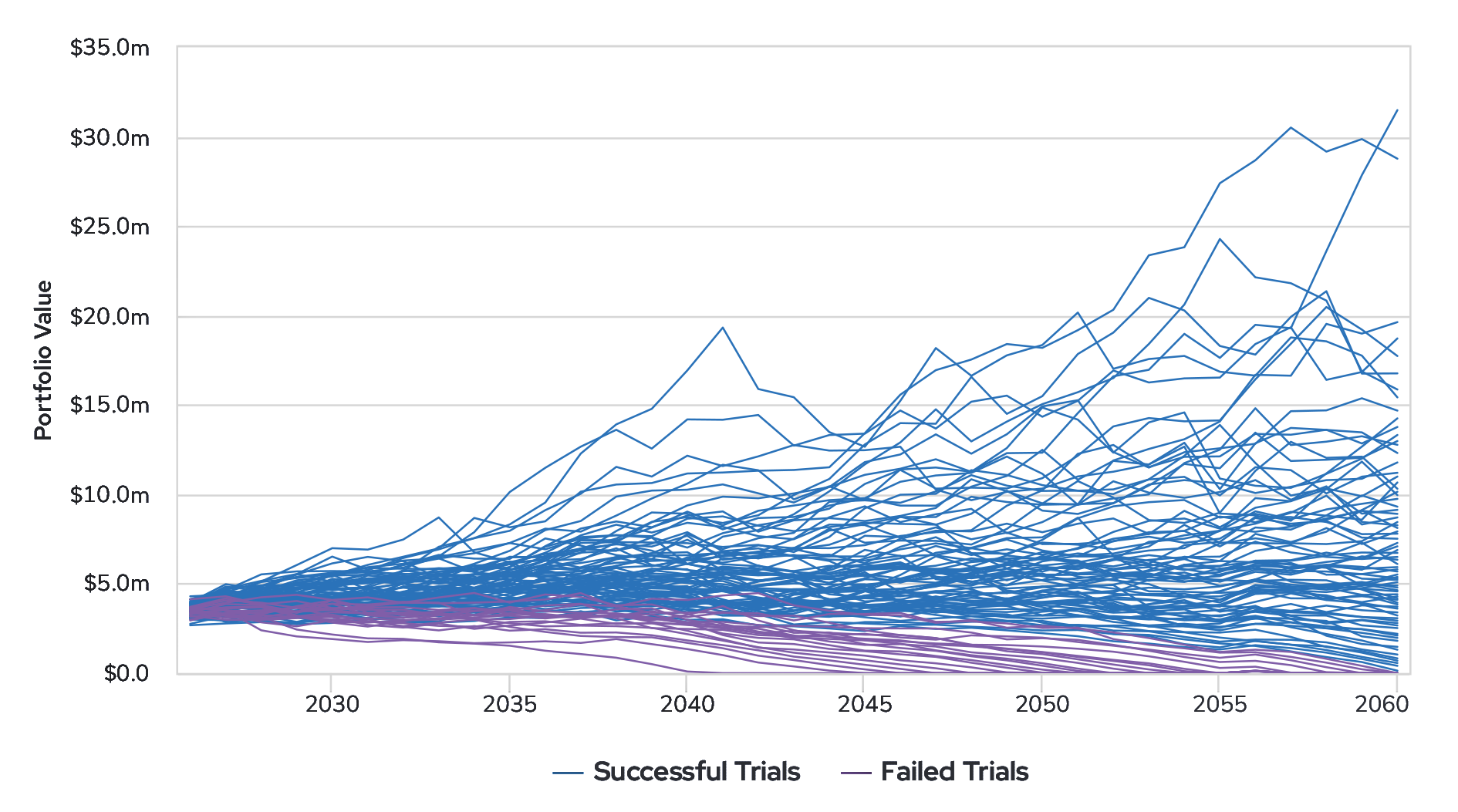 A stress test evaluates how your financial plan performs across a wide range of potential economic and market environments. Rather than assuming one path forward, it models many possible futures. A Monte Carlo analysis, such as the one shown below, will run numerous variations of data to evaluate the resilience of a financial plan.